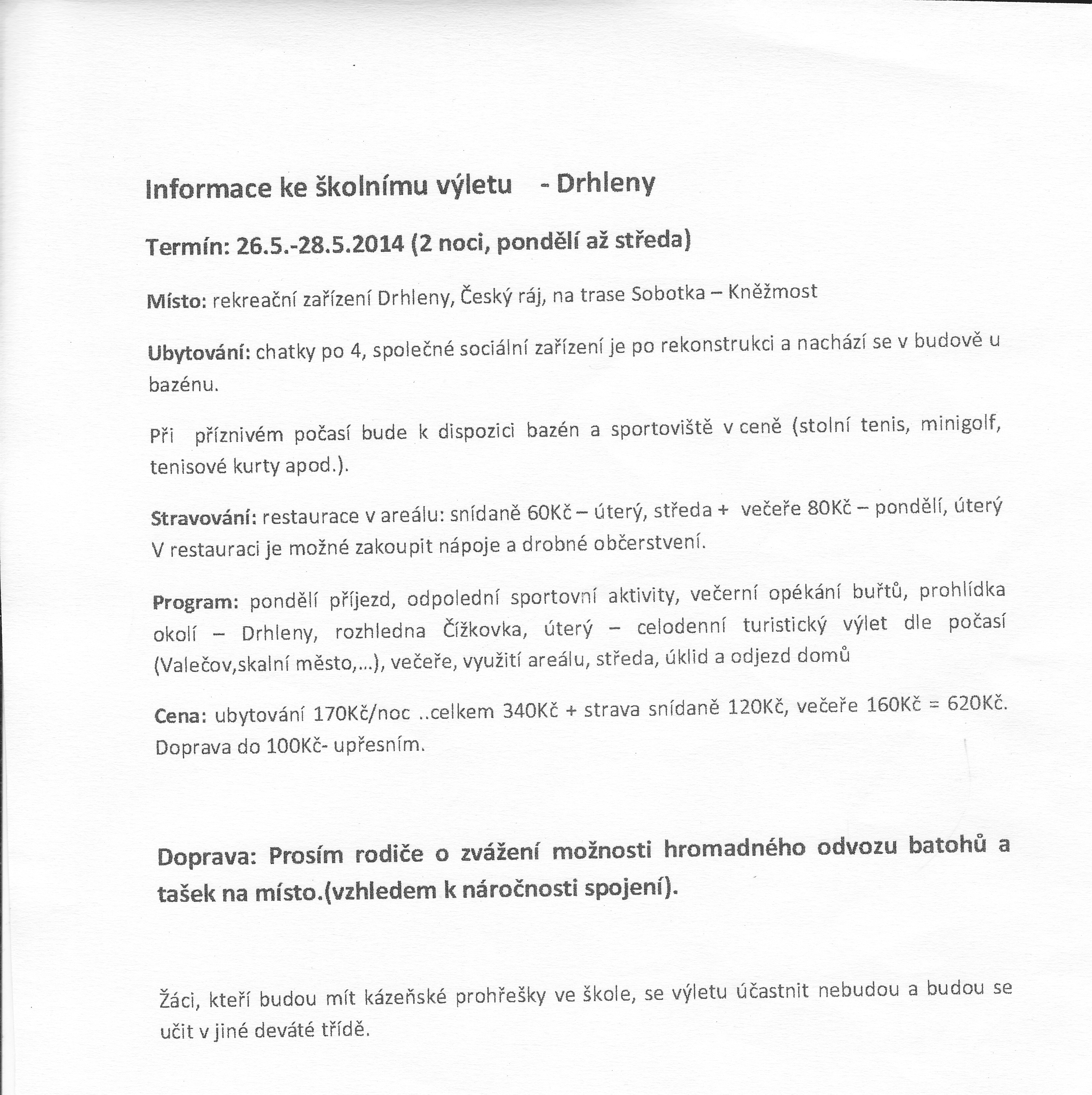 Vybíráme druhou část peněz na školní výlet, 420Kč. Peníze přineste prosím do pondělí 19.května. Vzhledem k tomu, že někteří žáci nezaplatili v daném termínu první zálohu, nebudou se moci výletu zúčastnit. Jedná se o tyto žáky: Malátová Nikola, Rygl Matěj, Novotný Eduard.